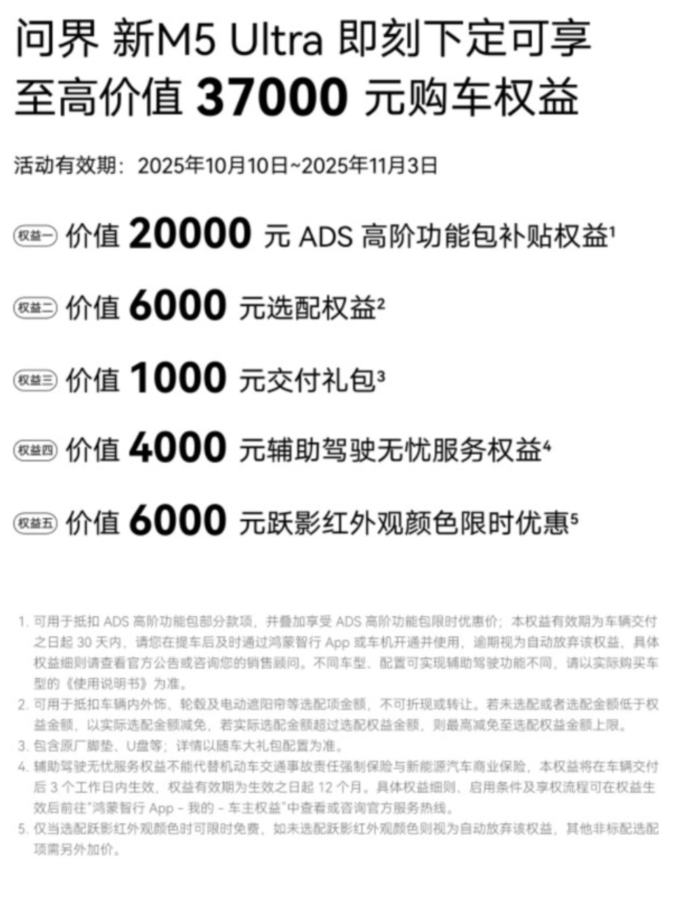 除了出色的产品力,问界新M5Ultra还提供至高价值37000元的购车礼遇,20000元ADS高阶功能包补贴、6000元选配权益、1000元交付礼包、4000元辅助驾驶无忧服务权益。跃影红新车色还推出6000元限时优惠,丰富的购车权益直击用户核心需求。